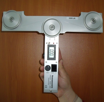 配有電子顯示屏 方便導入被測材料 小巧而且結構緊湊 電池供電 描述: 電子張力儀,電池供電 小巧手持式儀器,可單手操作 用于短時間測量,直接讀出測量值 方便導入運動中的被測材料 應用: 用于測量以下材料張力: 玻纖、光纖, 碳纖及其它脆性材料 輪子: 配置柱狀鋁質輪子,內置球軸承,D=50毫米 額定負載: 規格 20 N ( 2000 cN ) ,精度: 0,01 N ( 1 cN )